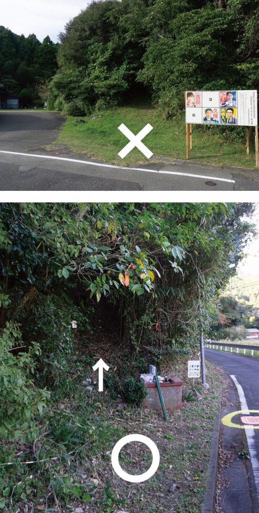 2.(地図22-2左ページ)小田坂峠の登り口は、恵比須浜沿いの道と県道25号の交わった場所ではなく、150メートルほど県道を北に進んだ左側にあります。民家横の広い登り口は私道で、住人の方が迷惑をしているので、決してここから登らないようにしてください。※現在、入らないように柵が設置されています。(小田坂峠を越えない場合は関係ありません)